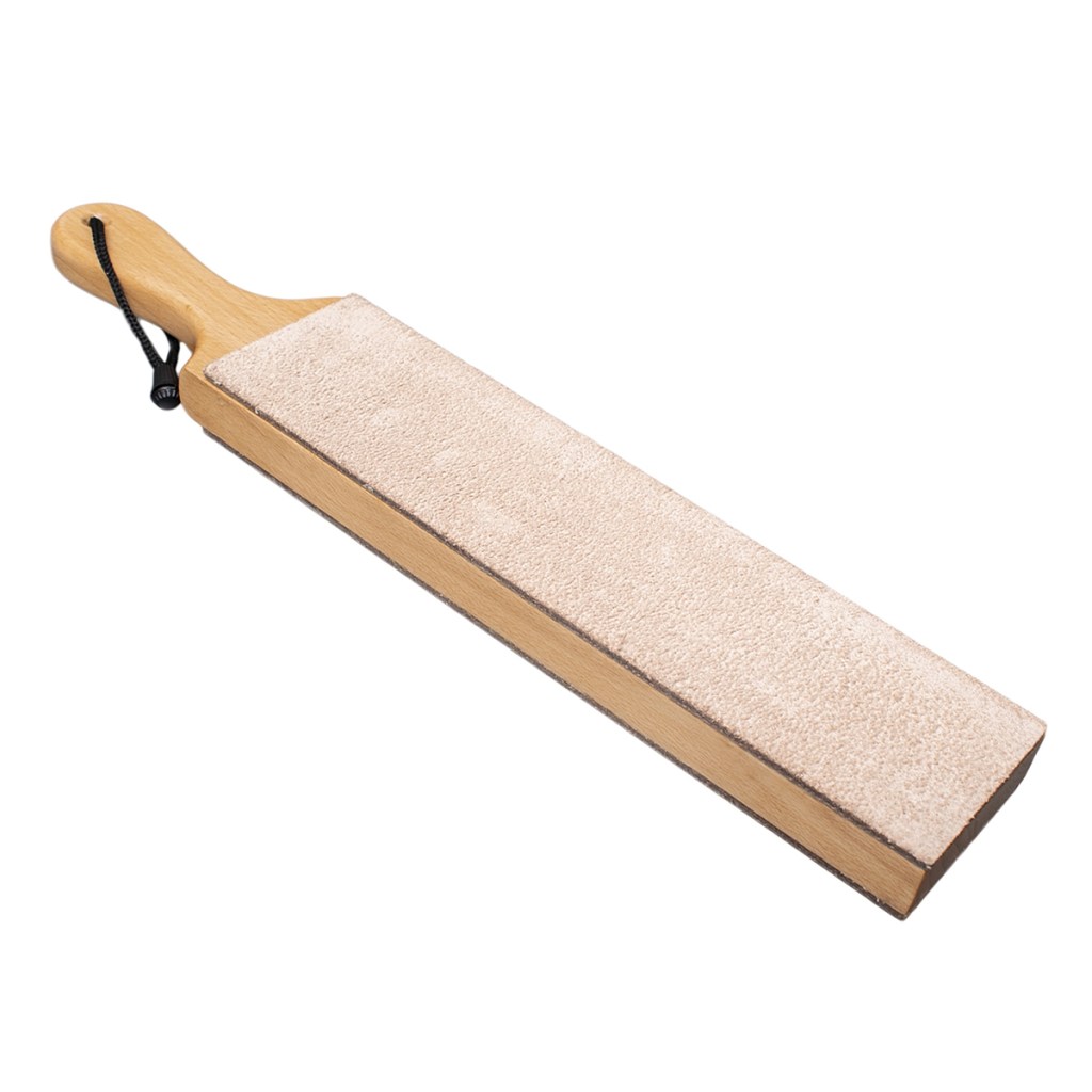 Stropping a knife is a finishing step. This is often done with a leather strop, either clean or impregnated with abrasive compounds (e.g., aluminum oxide or diamond paste), but can also be done on paper, cardstock, or cloth. Most modern-day knife makers power-strop their knives on cloth buffing wheels. Stropping removes little or no metal, but produces a very sharp edge by either straightening or very slightly reshaping it. It may bring a somewhat sharp blade to “like new” condition.
