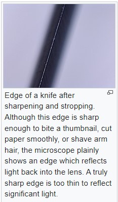 - stropping (also referred to sometimes as polishing) giving a mirror finish, but not significantly altering the edge.