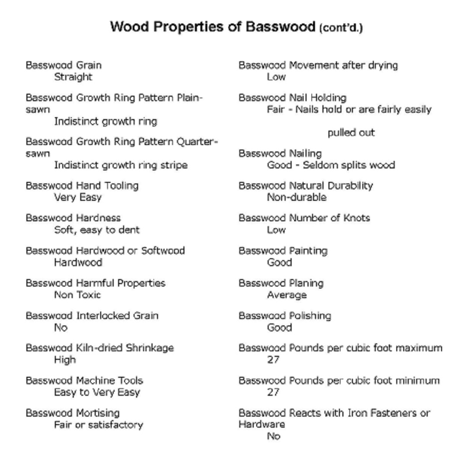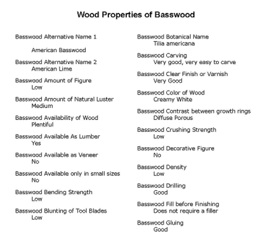 I don’t intend to cover all 80 species but I will try to periodically provide the list of information for certain specific wood species here on the blog. Since most of us carve basswood I figure that’s the wood most of you would be interested in so here below is the list of Wood Properties of Basswood: