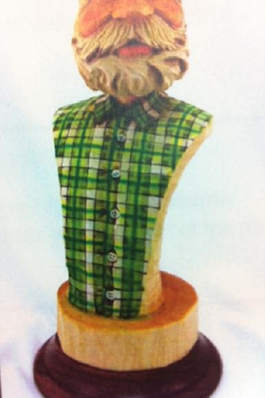 I couldn’t find the colors I wanted or liked, so I ended up using my liner, which again seemed to give a more faded effect that I liked. When I paint on the wood, I keep the wood damp if I am painting the face and areas where I want to blend colors. But I paint the shirt with the wood dry, and also dry between the colors and rows I paint, just like I did with the paper. Now, when I’ve finished all the plaid, I will spray it with water and get it damp and may then add some washes of gray for shadows in the wrinkles around the buttons and other places. That’s so I can blend them in, rather than just having a big blotch of color. So that’s how I did mine…..If you try it, you will find it is not as complex as it appears and it can give a nice effect to a carving.