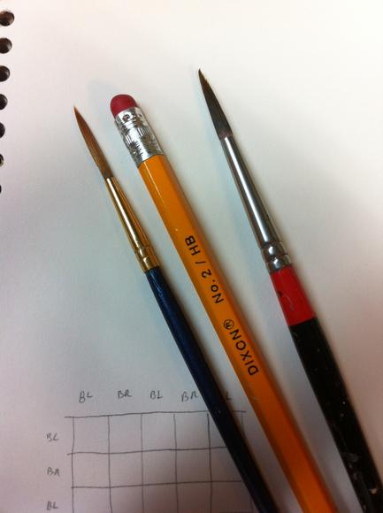 I use a round brush that holds a good bit of paint, but has a fine tip that lets me paint details as needed. I use it for the wide stripes, but a flat brush might work better. The other brush is a long liner, that I use for the thinner lines and stripes. I have a smaller one but this one holds a bit more paint so I can make a line in one continuous stroke.