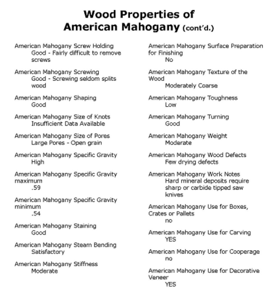 Although American Mahogany is considered a hardwood, it carved relatively easy and has an appealing grain and finishes beautifully. Here are the wood properties of American Mahogany: