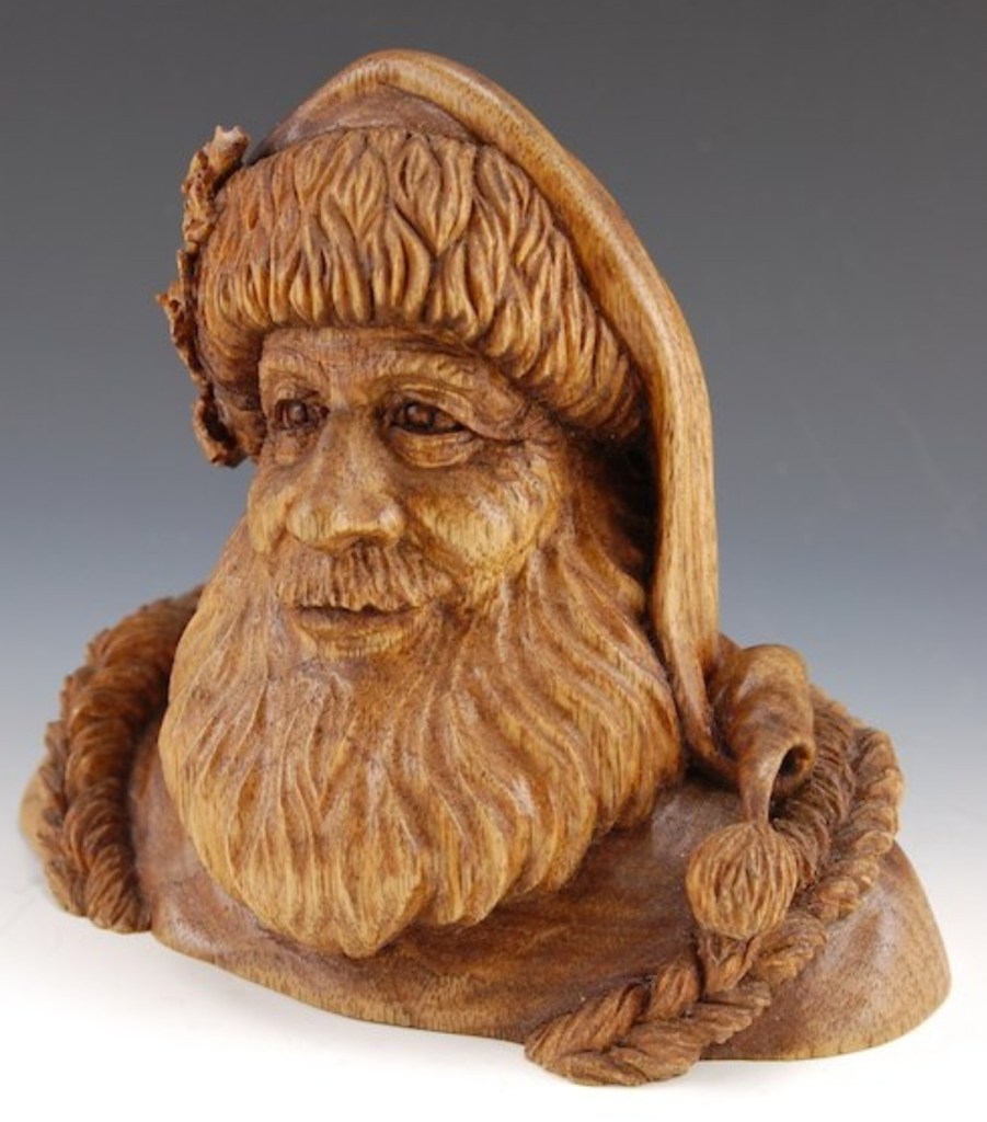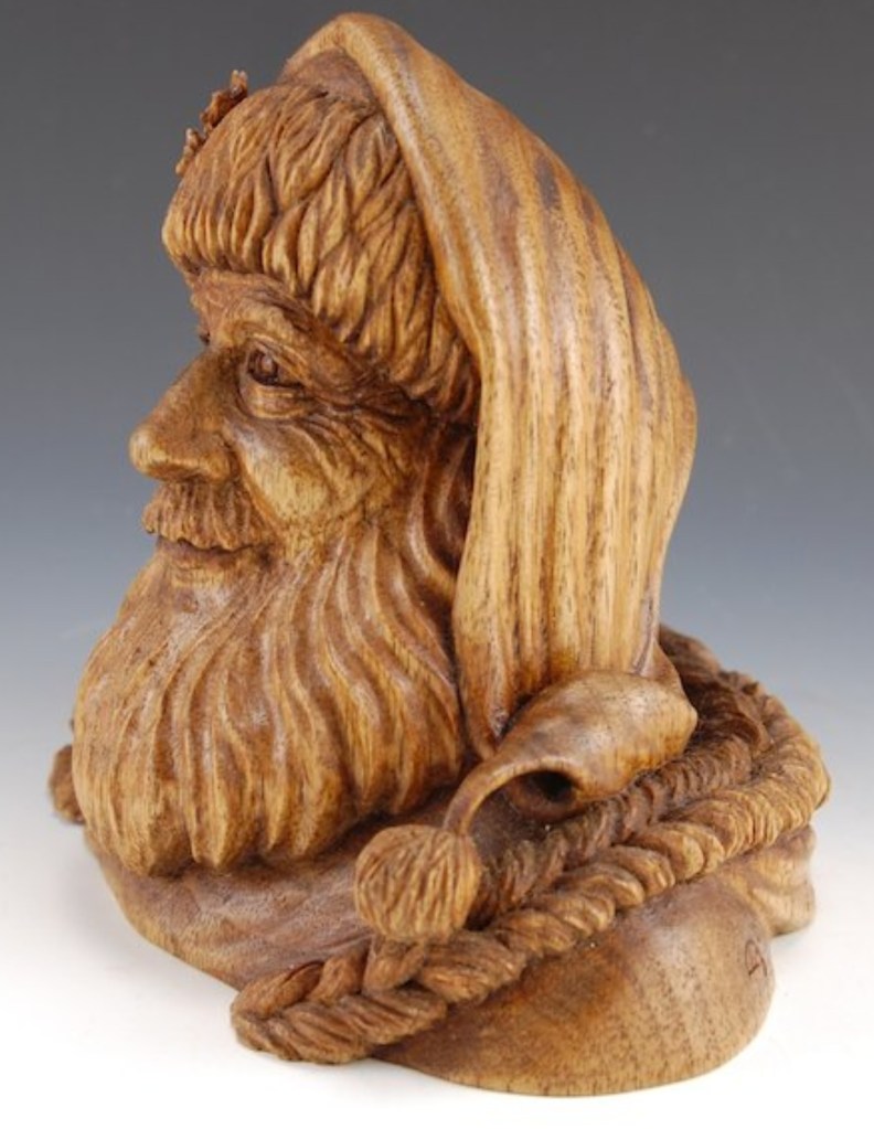 “Sharing a Santa bust I carved in Butternut. Butternut has a beautiful grain pattern that can be taken advantage of to establish a contour flow accenting movement seen in the hat. Butternut is also ideal to carve delicate details, as shown in the Holly on the hat and details surrounding the eyes.