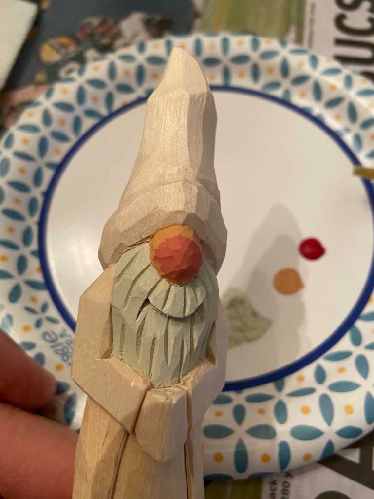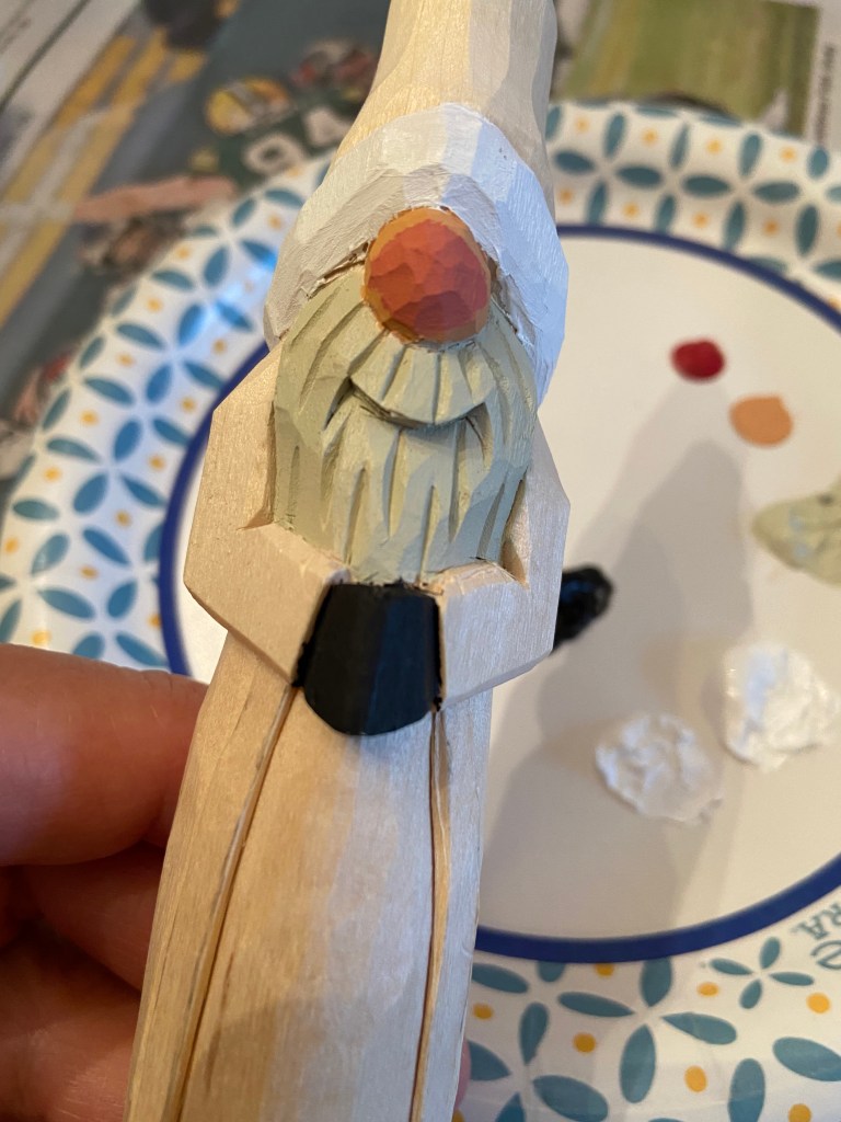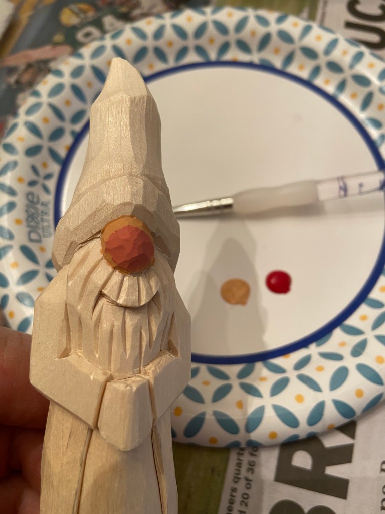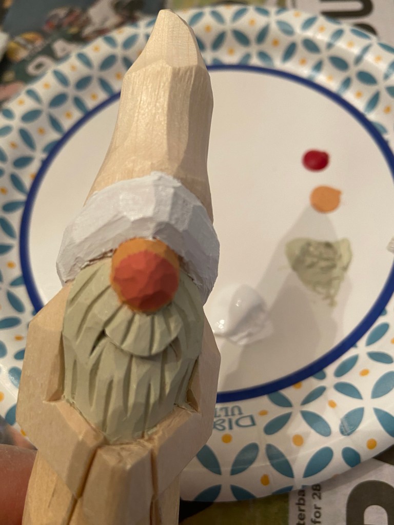 Step 8. Paint the nose with Americana medium flesh and tomato spice. Then paint the mustache and beard with Liquitex parchment. Finally, paint the hat trim with Liquitex titanium white.
