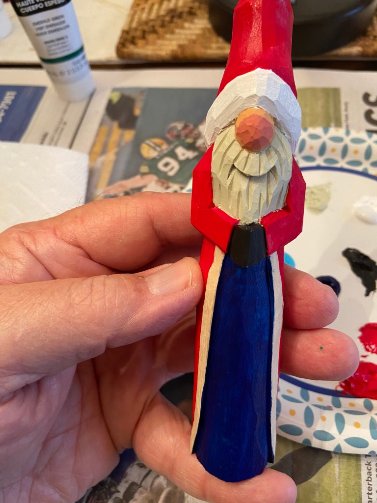 Step 9. Paint the gloves with Liquitex mars black and the under robe with Liquitex phthalocyanine blue (any navy blue color will work here). Then paint the hat and outer robe with Liquitex naphthol crimson (or any bright red), and finally paint the robe stripes with Liquitex titanium white.