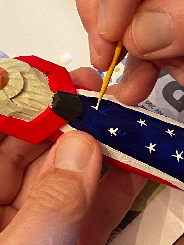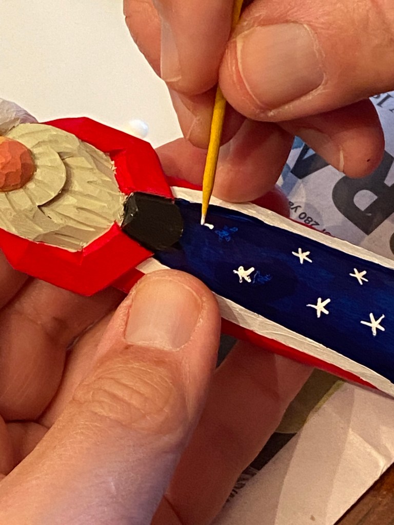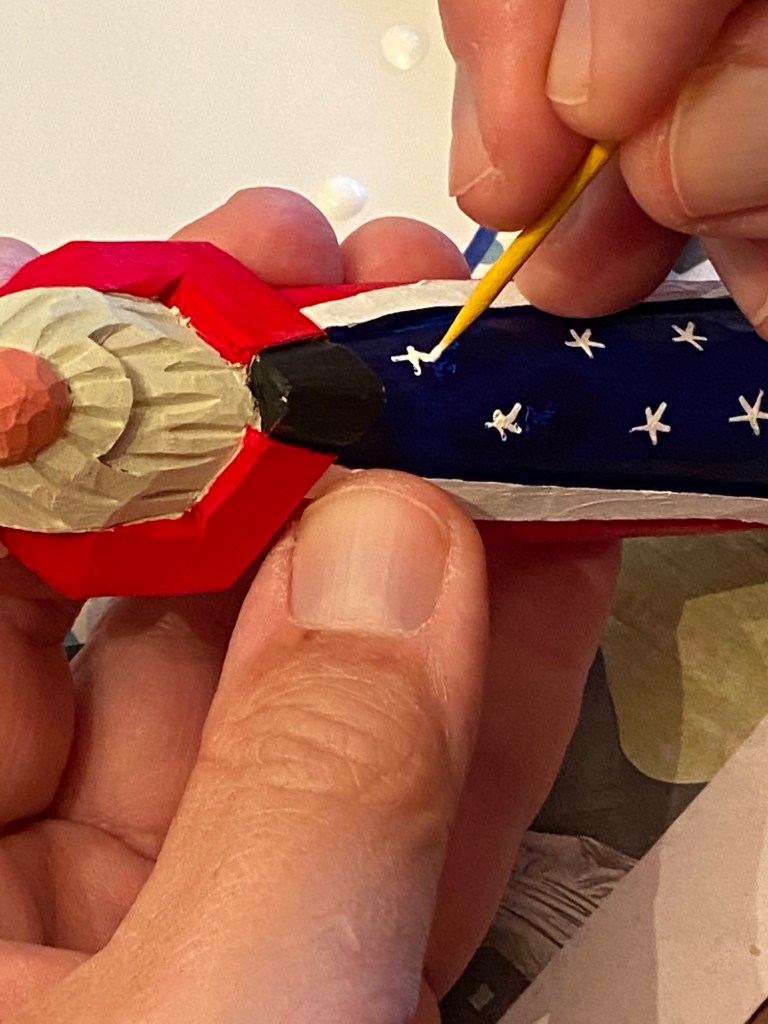 Step 10. To paint the stars dip the end of a toothpick (I prefer a round toothpick because it has a sharper point) into diluted titanium white. Touch the toothpick tip to the carving and carefully drag it slightly in one direction. Dip the toothpick into the paint again, place it at the point where the center of the star will be and carefully drag it out in another direction. Repeat this process three more times (total of five lines). Make several white stars randomly around the blue under robe to complete the carving.