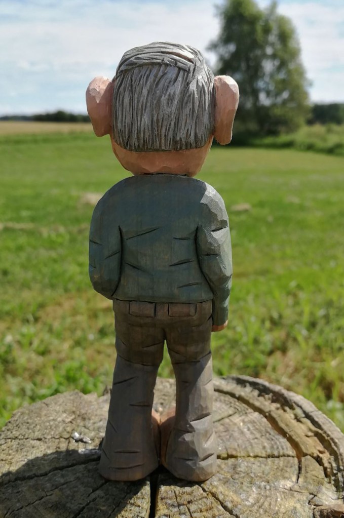 You did a terrific job on Gerry and I can see you are really benefiting from your two Pete LeClair books, which I highly recommend to any wood carver interested in caricature carving. I like everything about your carving from top to bottom. The face, including the eyes, nose and mouth is very well carved, and you’ve given it a good expression. The ears and hair are also done well. I especially like the way you carved the hands, which many wood carvers struggle with. Both hands show good proportion and detail.