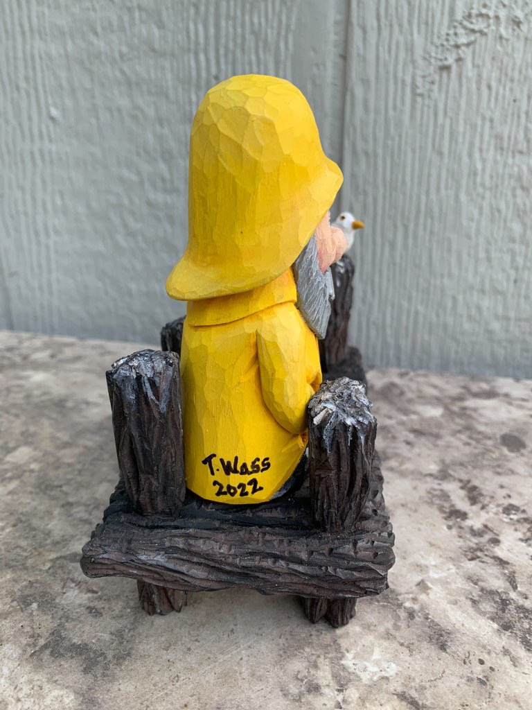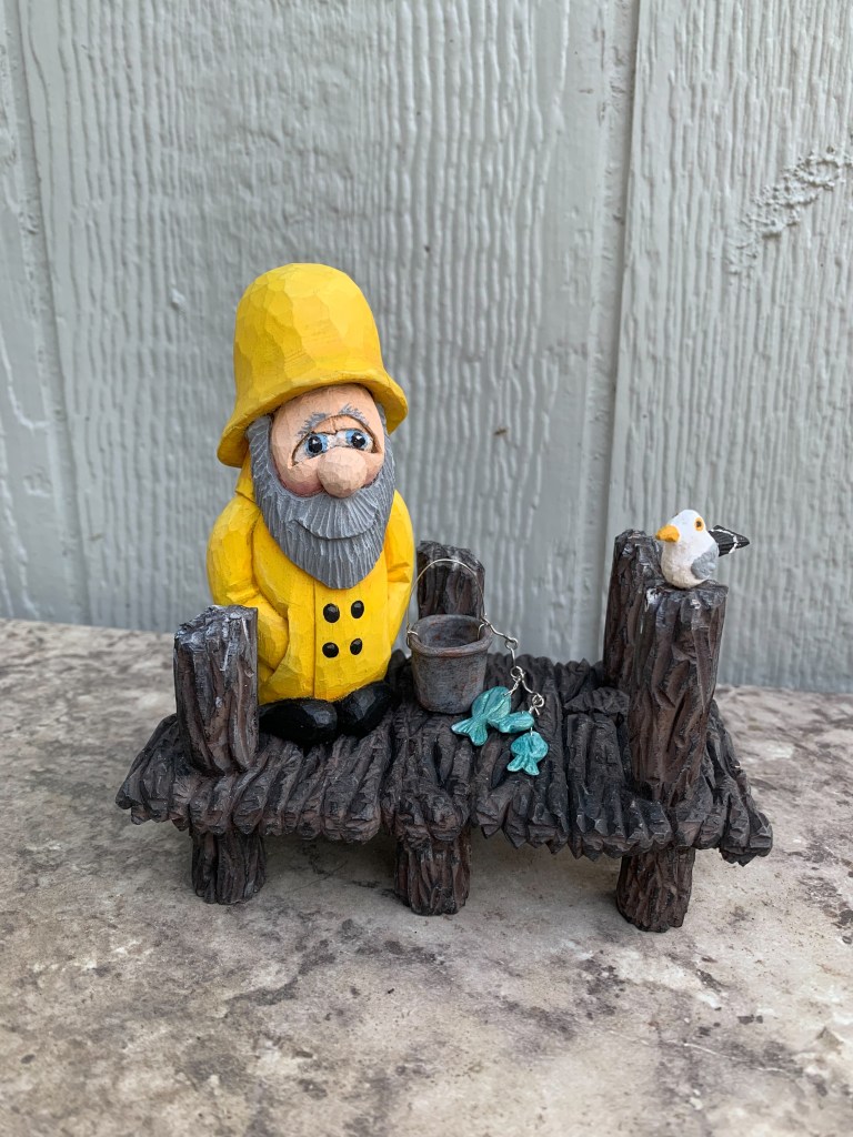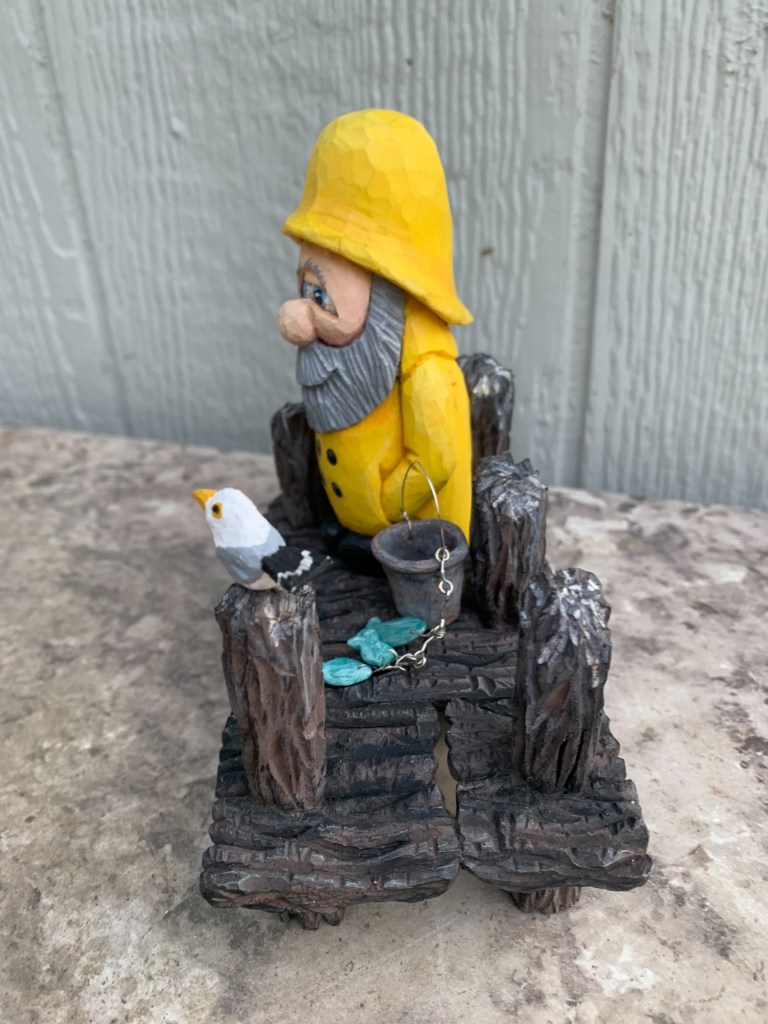 Honestly, I don’t have much to say about it. It’s excellent in every way. Although the fisherman itself is a rather average caricature, however well done, you’ve paid exceptional attention to all of the details of the carving scene. I’m particularly blown away by the dock and all the detail you put into the carving and painting of the planking and pilings. I would love to know how you did them. The seagull, bucket and fish are nice additions, and the seagull is well painted.