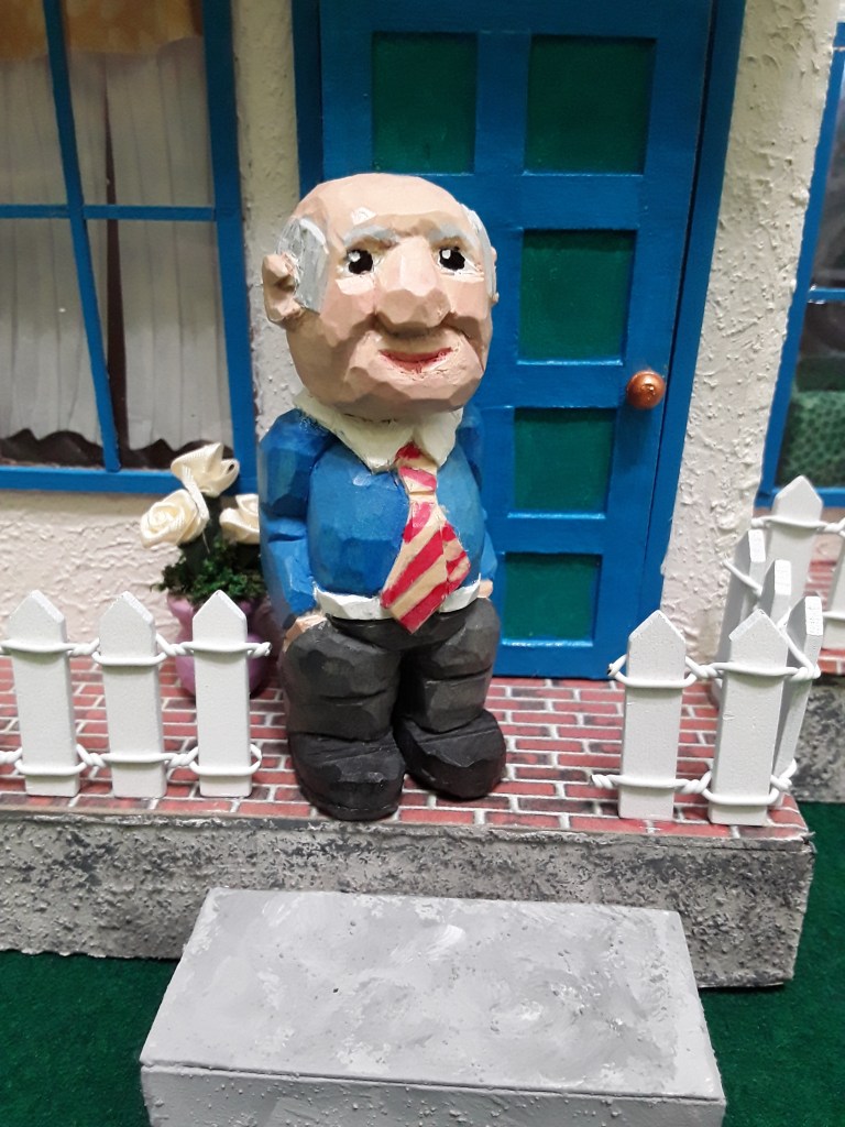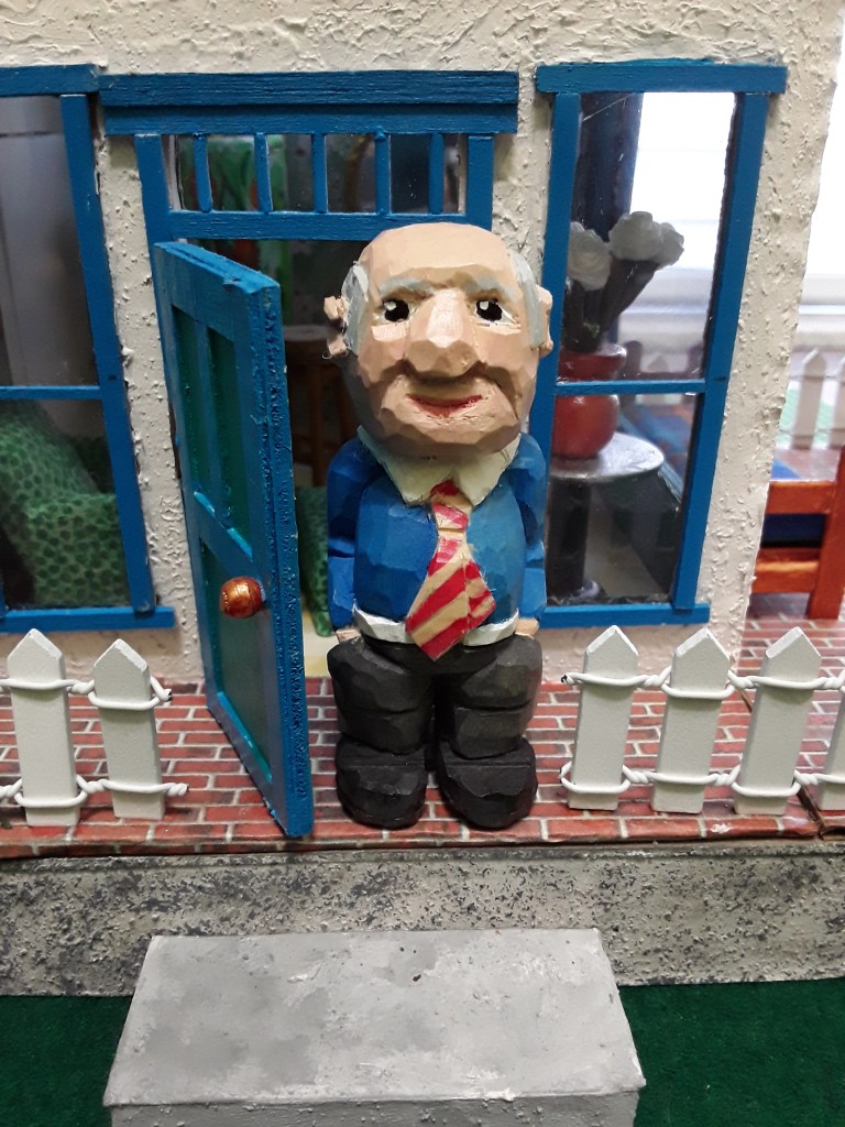 Here are a couple of photos of a miniature 3 inch figure that I carved in front of a quarter scale dollhouse that I built out of cardboard and craft wood. Any advise or critique would be welcomed.