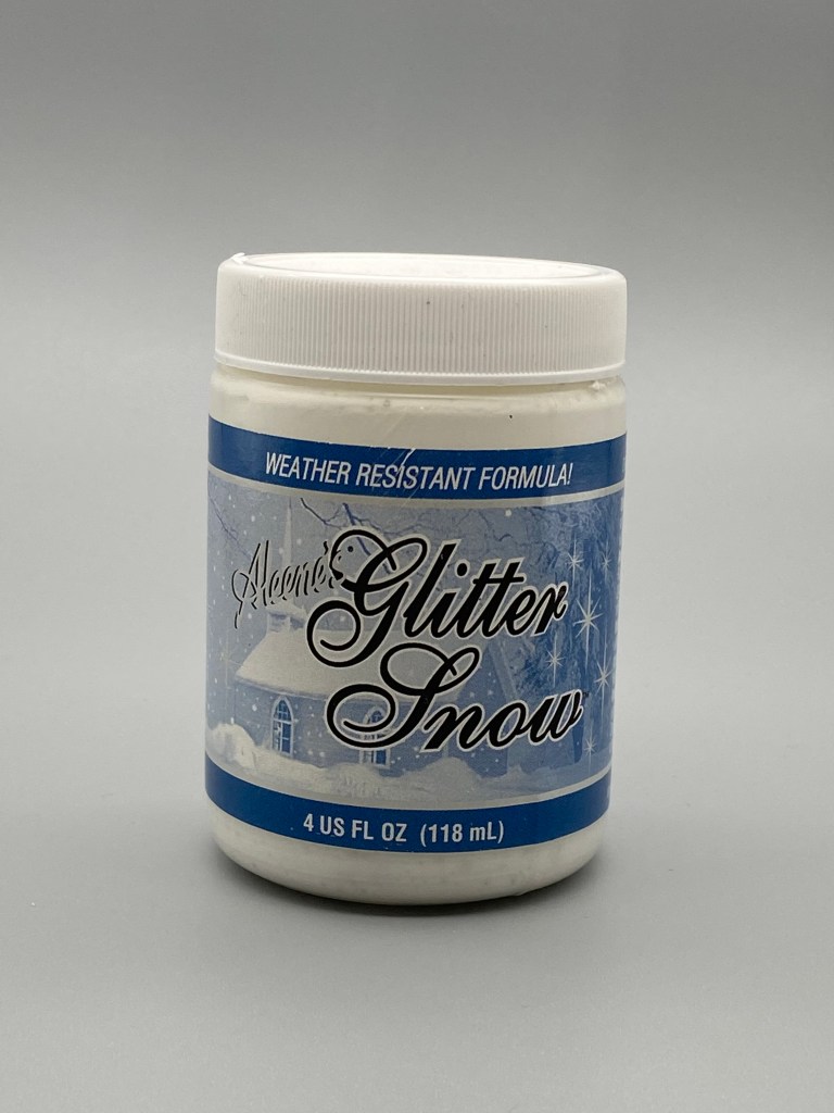 Aleene’s “Glitter Snow” – 4 oz. jar – $7.76…..is a thin white paste-like medium with a very tiny amount of glitter in it to add some sparkle to your project. Like “True Snow spreads on and adheres to anything. Goes on Smooth leaving a smooth finish. Spreads like thin frosting, dries white, cleans up with water.