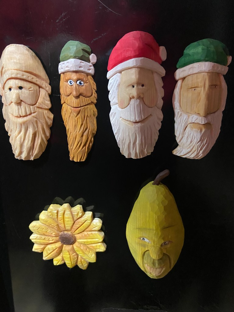 “Hi Bob, As usual, another fantastic edition of your Blog. Thanks for all your hard work. I’m slowly beginning to get back to carving after losing my wife and again, going thru Cancer treatments, which hopefully will be finished this next Monday. Fingers and toes crossed. I’m including a photo of some recent carvings I’ve completed. Some Santas, a Sunflower carved for a family member and Mr. Pear. All of them were inspired by someone but my memory has failed me again so will blame you as your Blog continues to be an inspiration to my carvings. Thank You for that. And Thank you for the face pattern. This will be very helpful as face proportions tend to drive me crazy. Respectfully, Jim Shay”