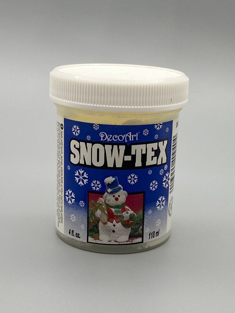 DecoArt “Snow-Tex” – 4 oz. jar – $7.76…..also available in 2 oz. and Jumbo 16 oz. jars…..”Snow-Tex” is a white texturizing medium that creates dimensional effects like snow and stucco on your projects…a little coarser look than True Snow. Somewhat thicker and harder to work with than “True Snow” and “Glitter Snow”. Dries white, cleans up with water.