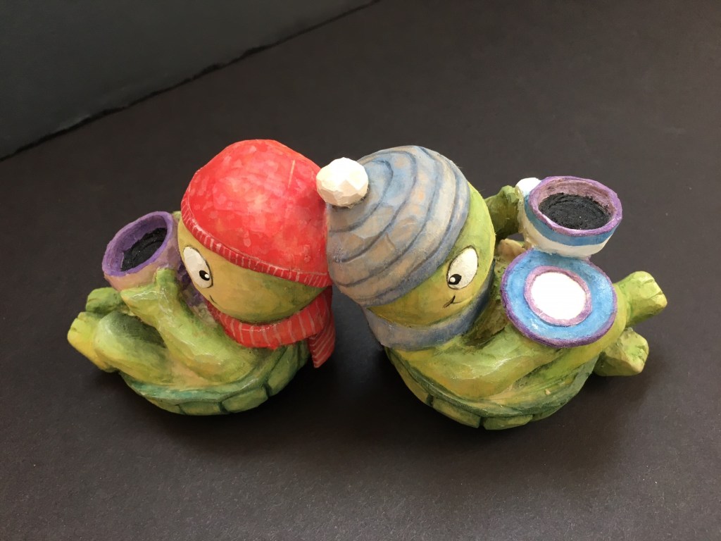 I absolutely love your turtles! They’re adorable and very well carved and painted. As a caricature carving I don’t see anything wrong with this one. I love the way you carved and painted the shells, and how you crossed the legs on the one turtle. I like how you carved the hands, and the facial expressions really finish off the carving. Excellent job on this one!