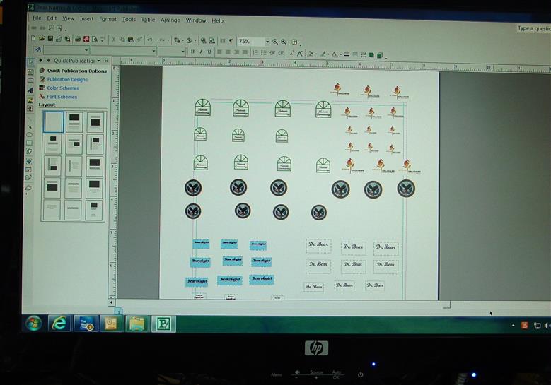 2. Then I import the emblem or logo into Microsoft Publisher and after measuring the actual size that I need for the caricature that I’m whittling I reproduce it a number of times using the sizing marks on the Publisher screen. I often will make a couple slightly larger and slightly smaller just in case I’m not satisfied with the size that I originally choose. At this time I will also create a text box and format it with color and writing as needed producing duplicates as I did with the emblems and logos.