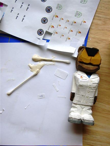 4. Once the sheet is dry I cut out each emblem, logo, and text as required and glue them in place on the caricature with Gorilla Type II glue. The reason that I use Gorilla glue is that it dries whiter in color than Titebond. And of course the reason that I use a Type II is that unlike a regular white glue such as Elmer’s it’s water resistant.