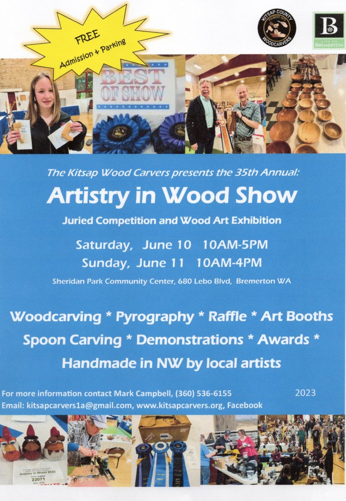 June 2-4 -Spokane, Washington. Spokane Carvers’ annual rendezvous at Tin Cup Cafe, 10013 W Charles Rd, Nine Mile Falls. Free classes, 8 to 4 daily. Roger (509) 467-3342; email Spokanecarversinfo@gmail.com. Web: SpokaneCarvers.com.