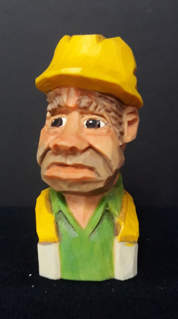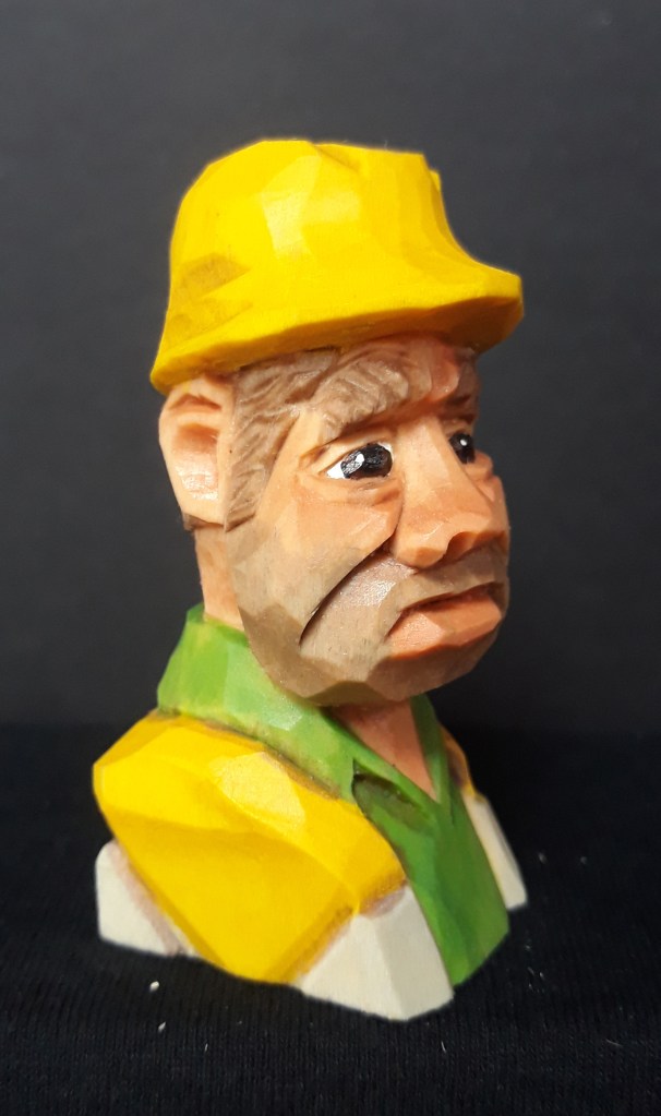 I received an entry to the Carver’s Corner this month from my good friend, Todd Martin from Huntington, Indiana. Todd asked if I would review the caricature bust of a construction worker he recently carved. Here is what he had to say: