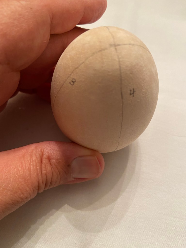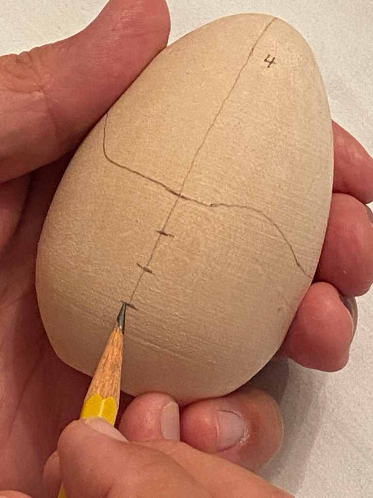 Step 1. Divide a basswood goose egg into quarters by drawing four light lines down the sides. Mark the lines 1 through 4.