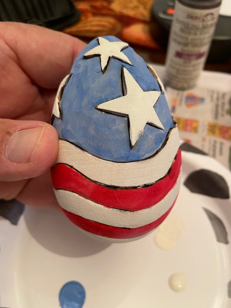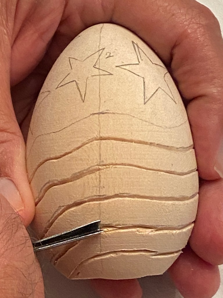I designed my Americana Goose Egg to be a simple project that can be completed in a short time with very few tools. A carving knife and V-tool are about all you need. So get cracking with a basswood goose egg and carve your own folk art symbol of America.