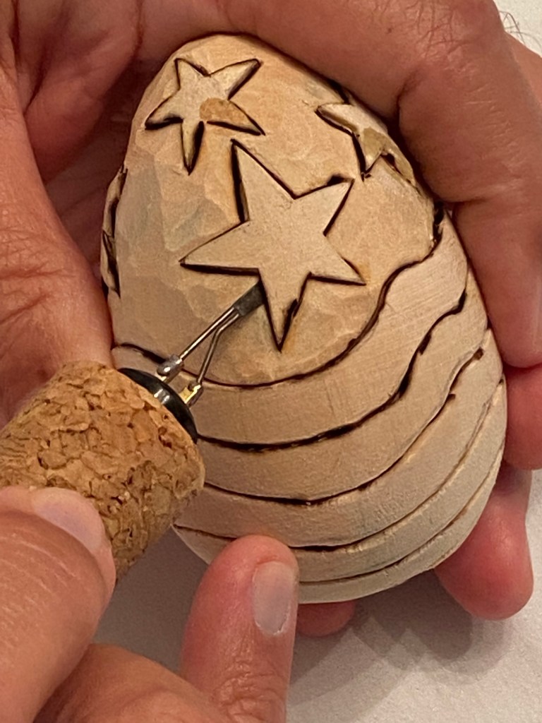 Step 7. Use a carving knife and a 3/8″ (9.5mm) #3 gouge to carve the stars and background around them. Make stop cuts around each star and cut back to them. You want to make the background approximately 1/16″ (1.5mm) lower than the stars. Use a wood burner with a skew tip to burn between the stripes and around the edges of the stars. The wood burning helps to prevent the paint colors from bleeding into each other.