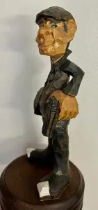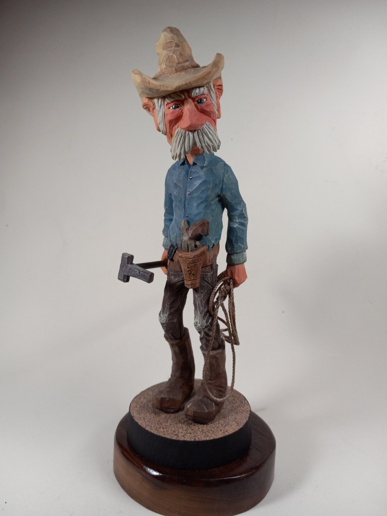 The 2nd picture is a cowboy I donated to our annual show, the Idaho Artistry in Wood. He drew a lot of attention. On the body is a separate head, rope and branding iron. Attaching pieces to a body can be quite tricky, but can draw a lot of interest from those who want to carve one or buy one. He had a good expression on his face that looks like a lot of stories and memories.