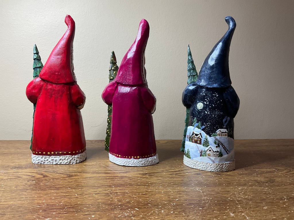 For the past 10 or 12 years I have carved a few Christmas ornaments or figures and invited my children to paint the carvings. The group has grown over the years to include their partners, a few close friends and this year my sister. It is one of my favourite days of the year and it’s a joy to watch everyone paint a carving which they can then take home to enjoy. Here’s a few from this years group. The carving pattern is from Sean Cipa’s book.